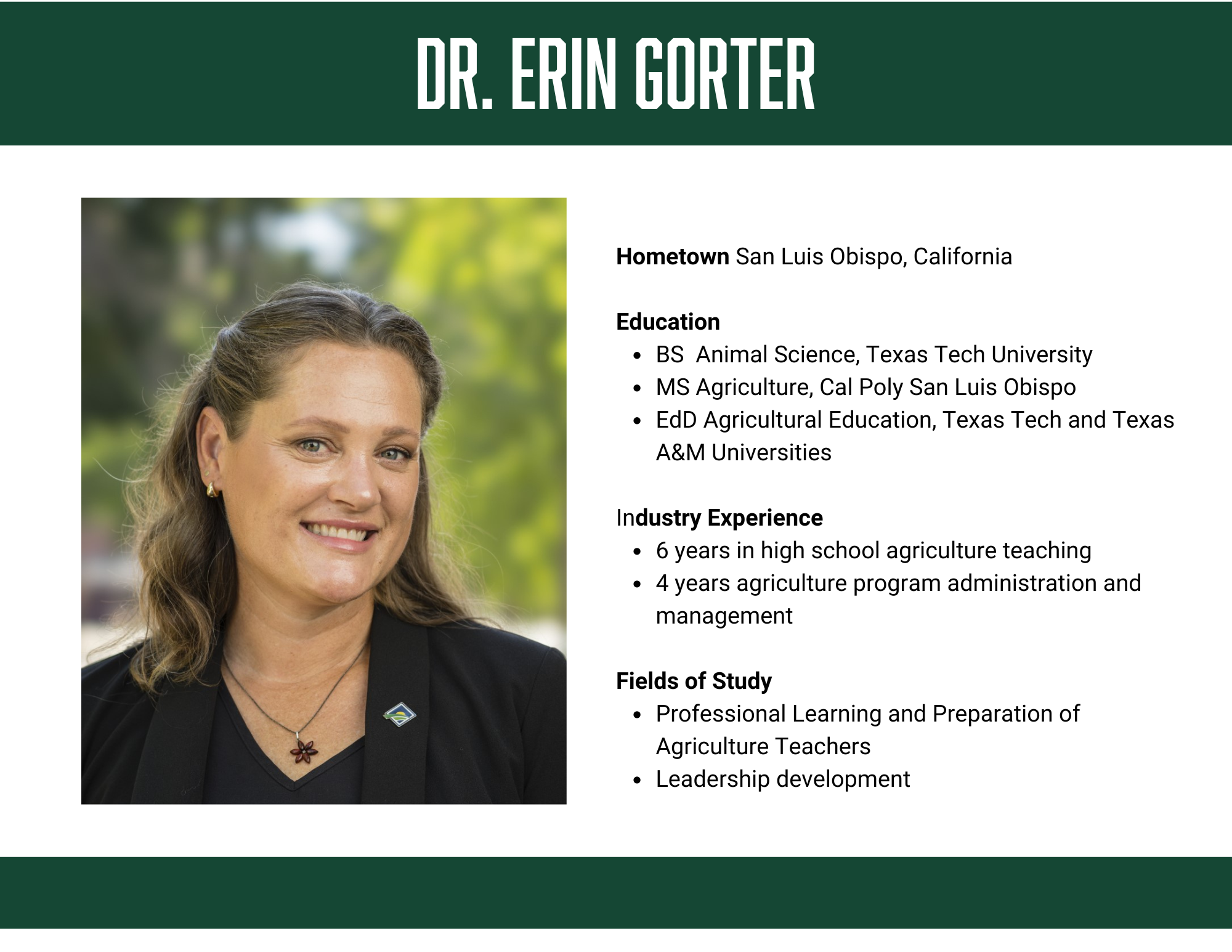 Erin Gorter, Ed.D. | 756-5362 | ekthomps@calpoly.edu | 10-242 |