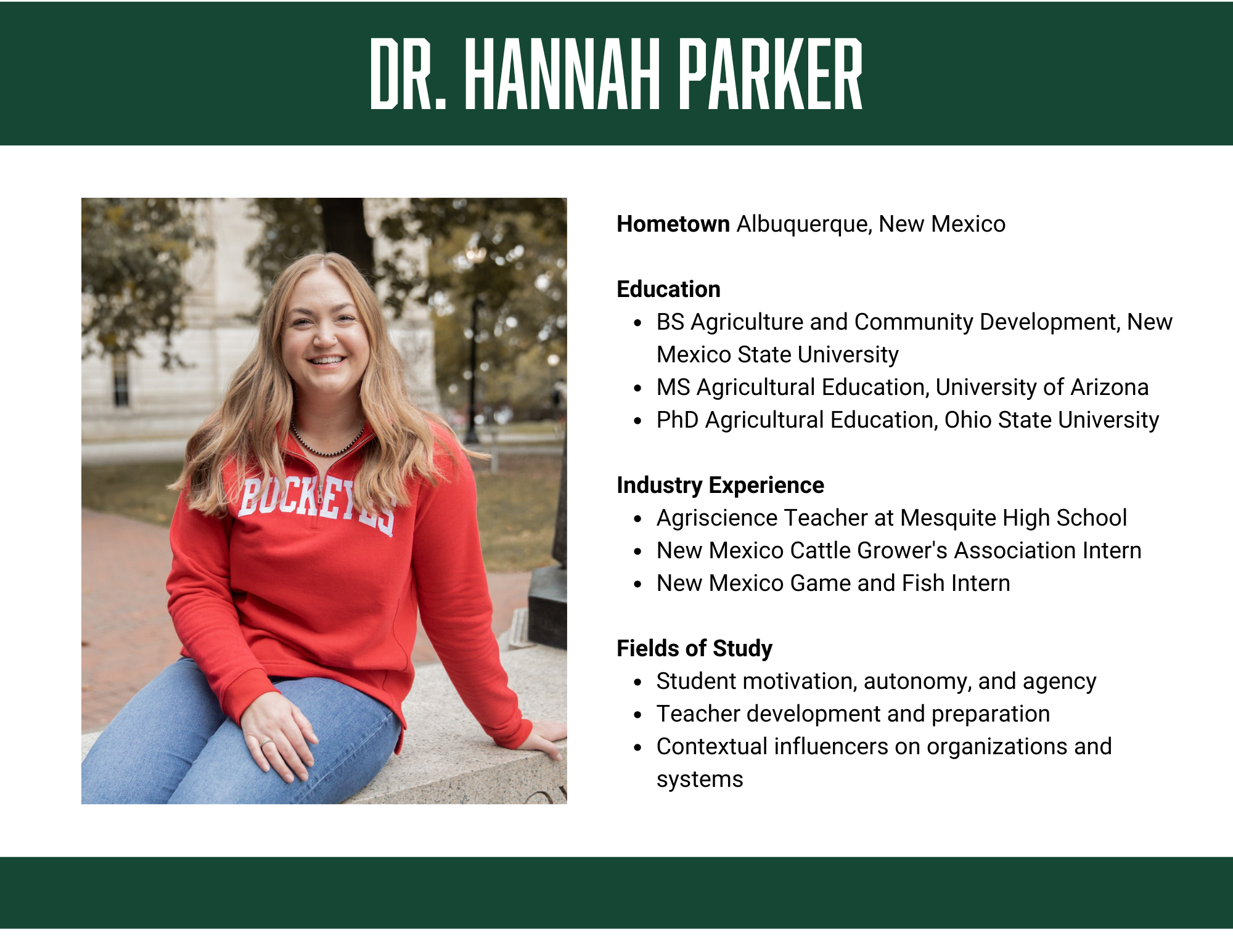 Hannah Parker, Ph.D. | 756-0663 | hparke07@calpoly.edu | 10-236 |