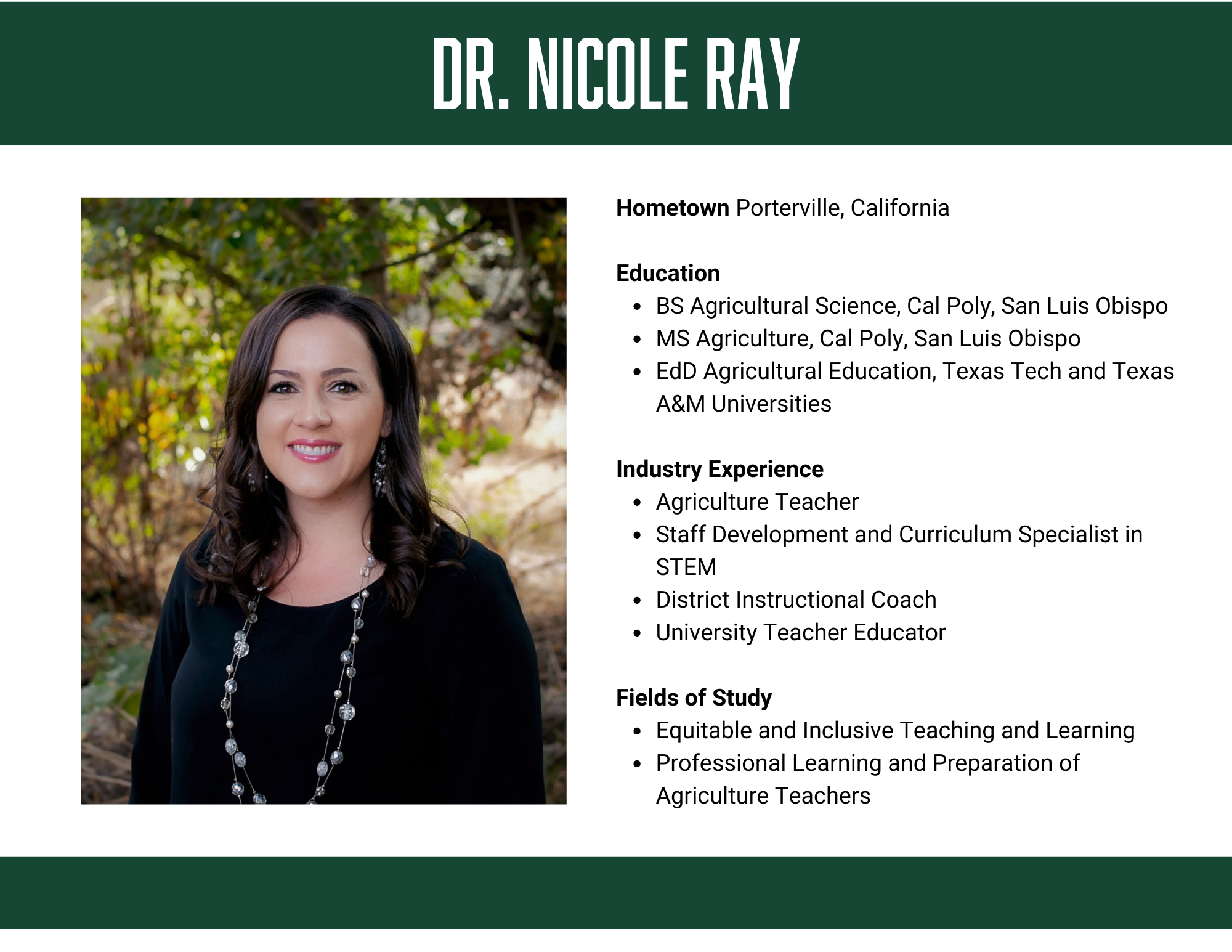 Nicole Ray, Ed.D. | 756-0661 | nray04@calpoly.edu | 10-246 |