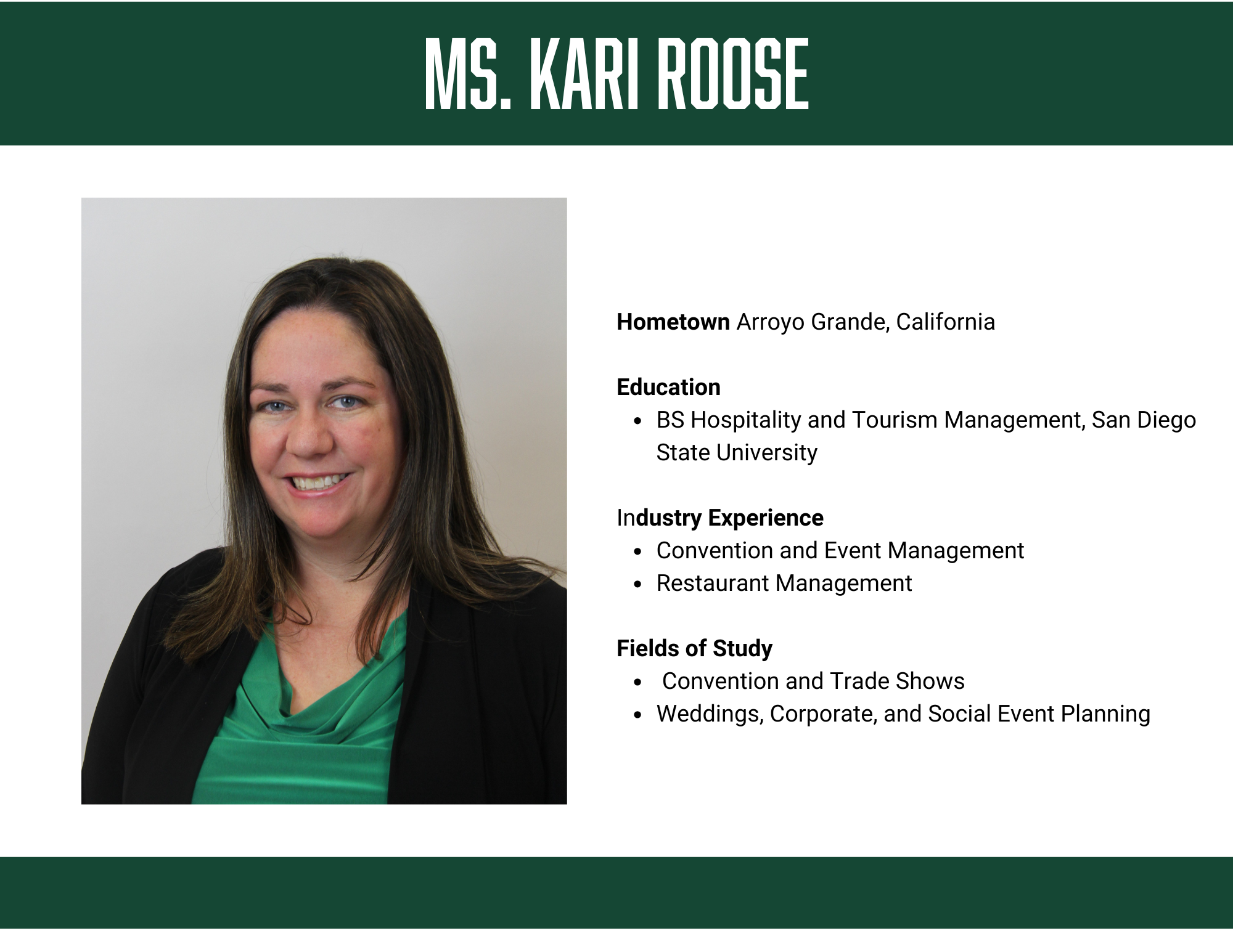 Kari Roose - Administrative Coordinator | 756-2803 | kroose@calpoly.edu | 10-244 |