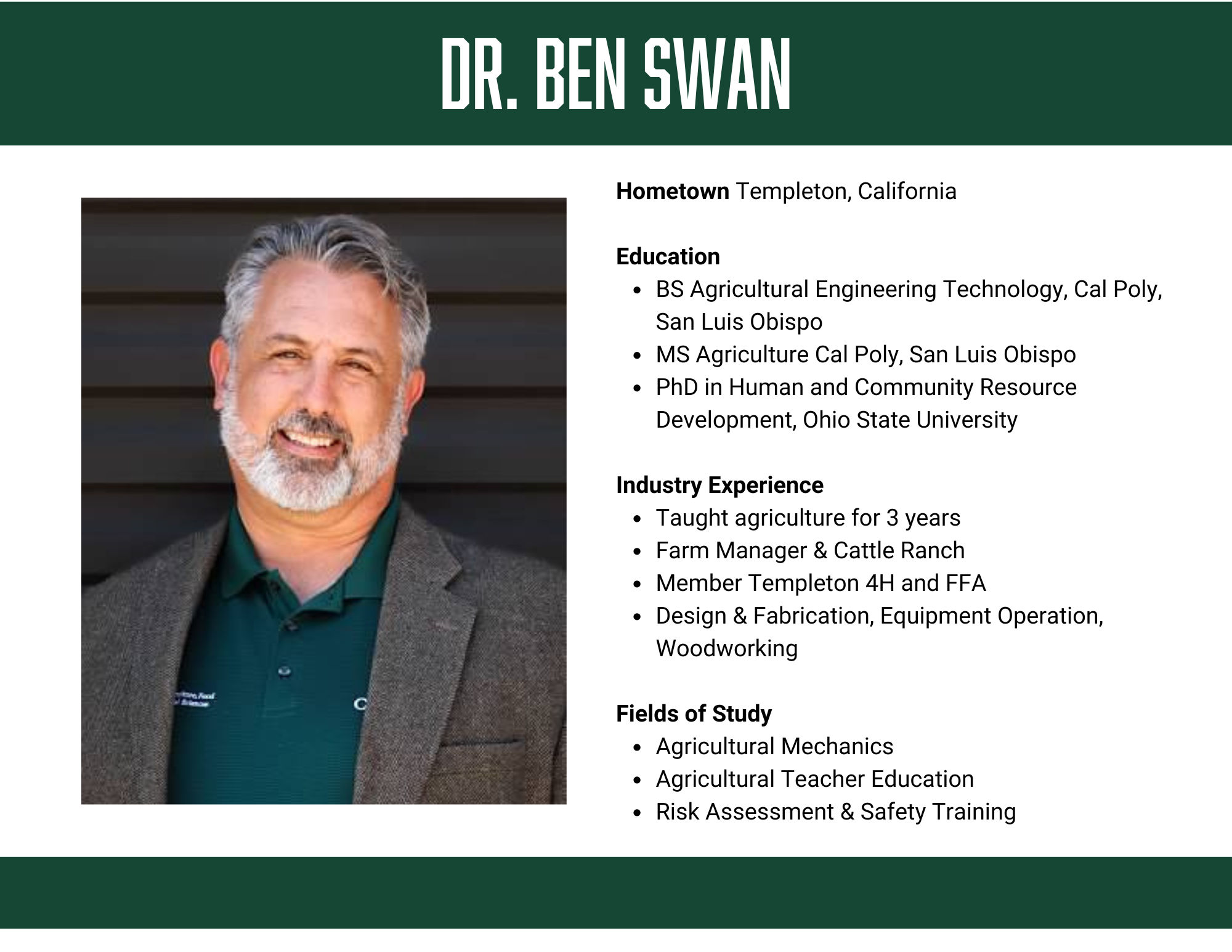 Ben Swan, Ph.D. Department Head | 756-2401 | bswan@calpoly.edu | 10-245 |